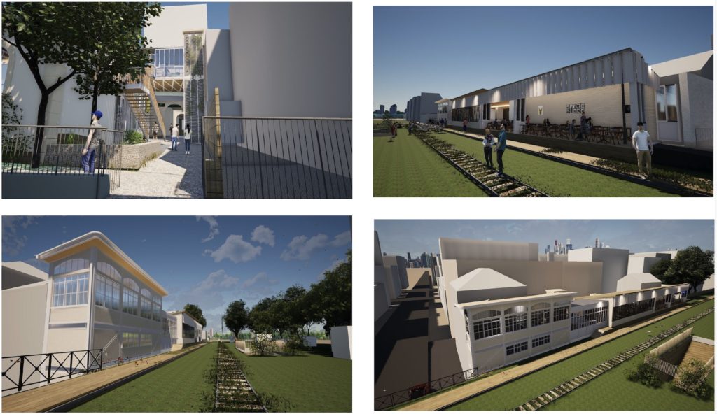 Quatre vues du projet « Passerelle A » autour de la gare de la rue d’Avron. 2LE Architecture