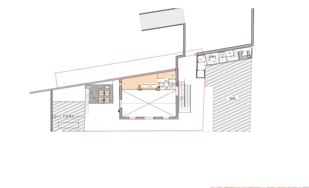• La petite structure devant l’ancien BV est remplacé par un conteneur bardé de bois accueillant un salon de thé (29,18 m²), avec une petite terrasse (30,85 m²) grâce à un escalier métallique