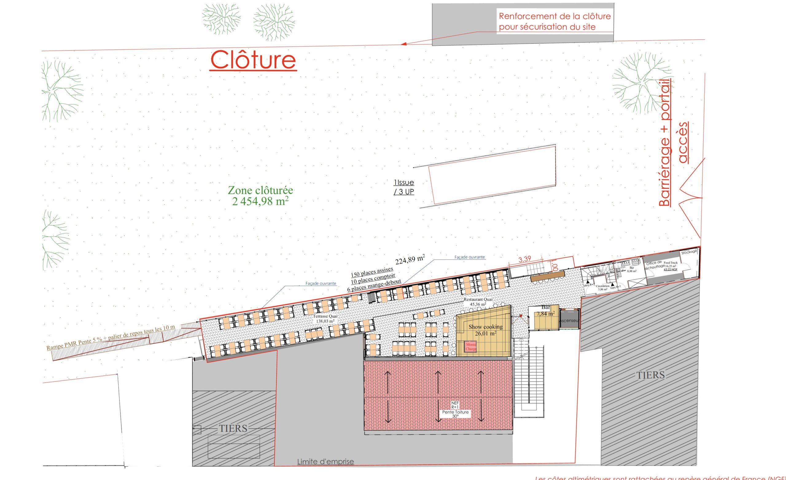 • Au niveau R+2, l’ancienne gare et le quai extérieur accueillent le Restaurant Quai (45,36 m²) et la Terrasse Quai (138,05 m²)