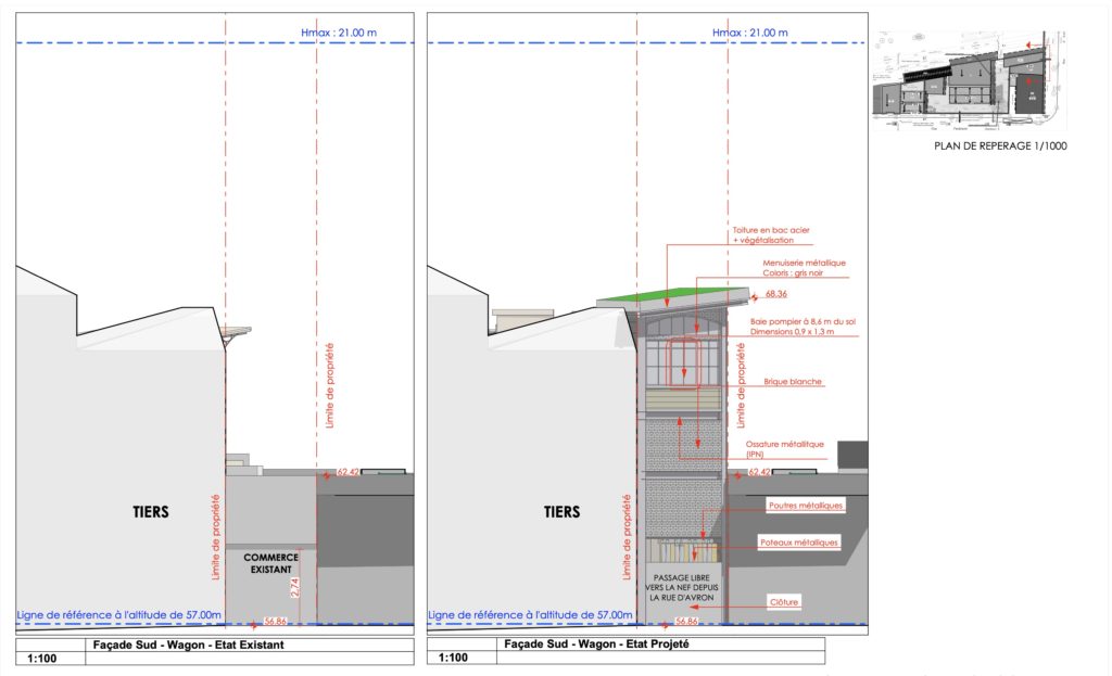 Le nouveau bâtiment de 3 étages, nommé « restaurant Wagon », sera bâti sur la parcelle comprise entre le viaduc de la Petite Ceinture et l’ancien hôtel de la gare situé au 117 rue d’Avron. « L’architecture choisie est métallique avec de grandes baies, évoquant une architecture ferroviaire », note la Commission du Vieux Paris. Une extension permettra de relier cette nouvelle construction à la « Nef » situé dans l’ancien BV. Une cage d’ascenseur doit prendre place dans la cour.